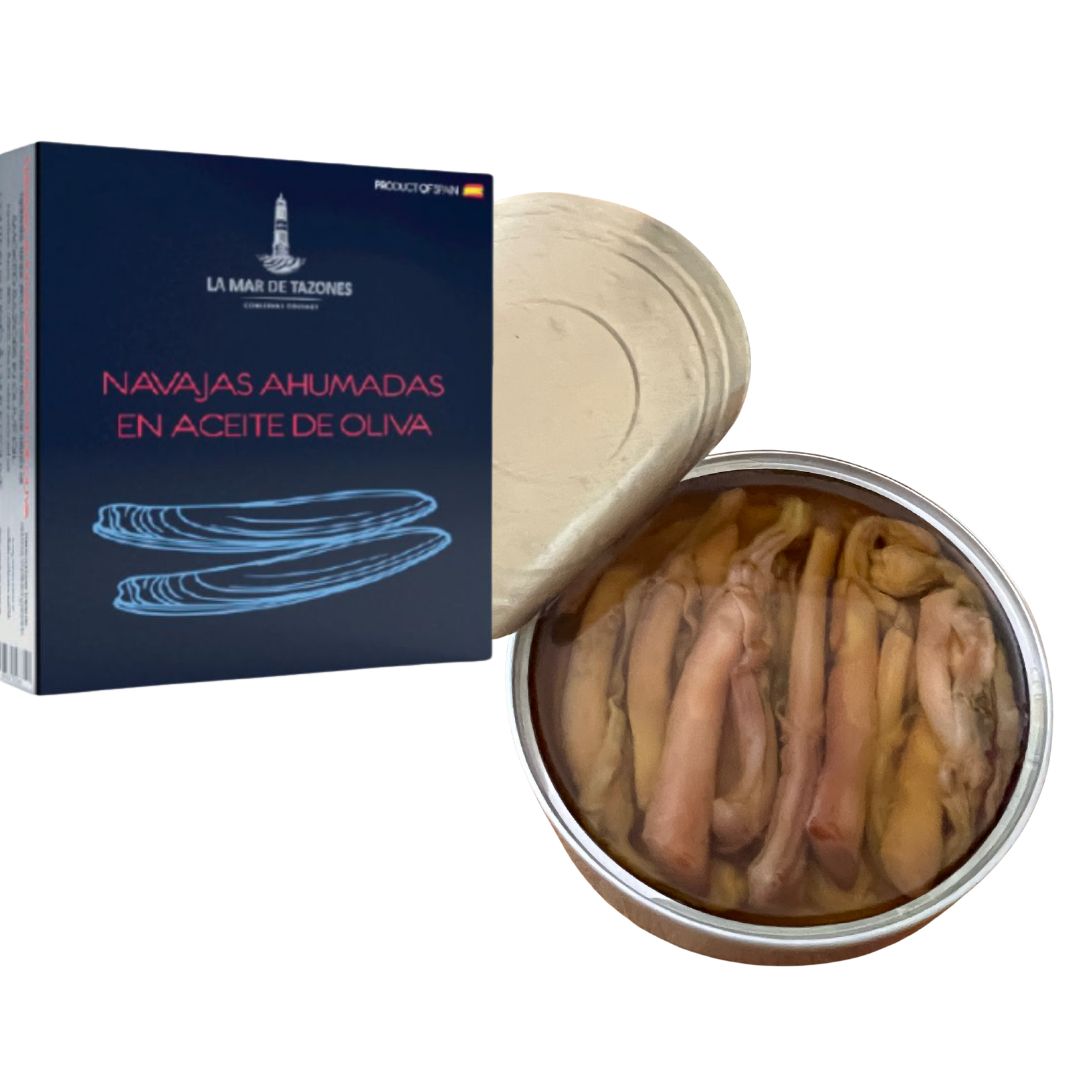 Ingredients: Razor clams, (Mollusks), Olive oil, natural smoke and salt.