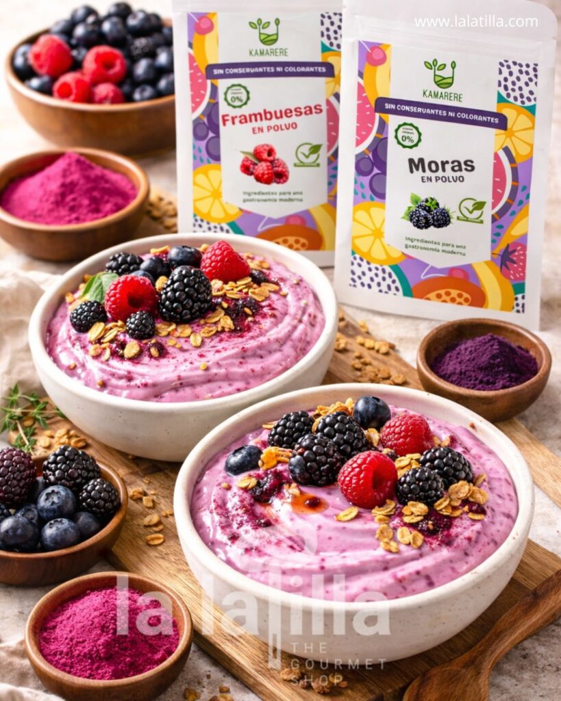 1. Yogur cremoso de frutos rojos con polvo de frambuesa y mora