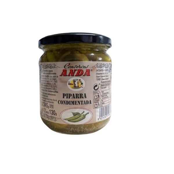 Piparras vascas condimentadas de la marca ANDA. Guindillas suaves y sabrosas, perfectas para aperitivos, pintxos y como acompañamiento.